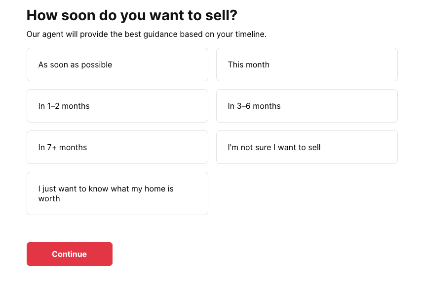 This screen asks how soon you want to sell so Redfin can route you to the right agent and set expectations for pricing strategy, prep work, and marketing. A seller who needs to list immediately usually needs faster guidance and a more aggressive plan, while someone with months can focus on value-adding improvements to their home (like repairs and home staging).