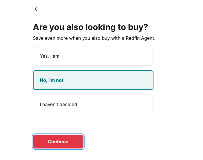 First, you'll need to enter your home’s address on Redfin’s selling platform and answer questions about your timeline, reason for selling, and property details.